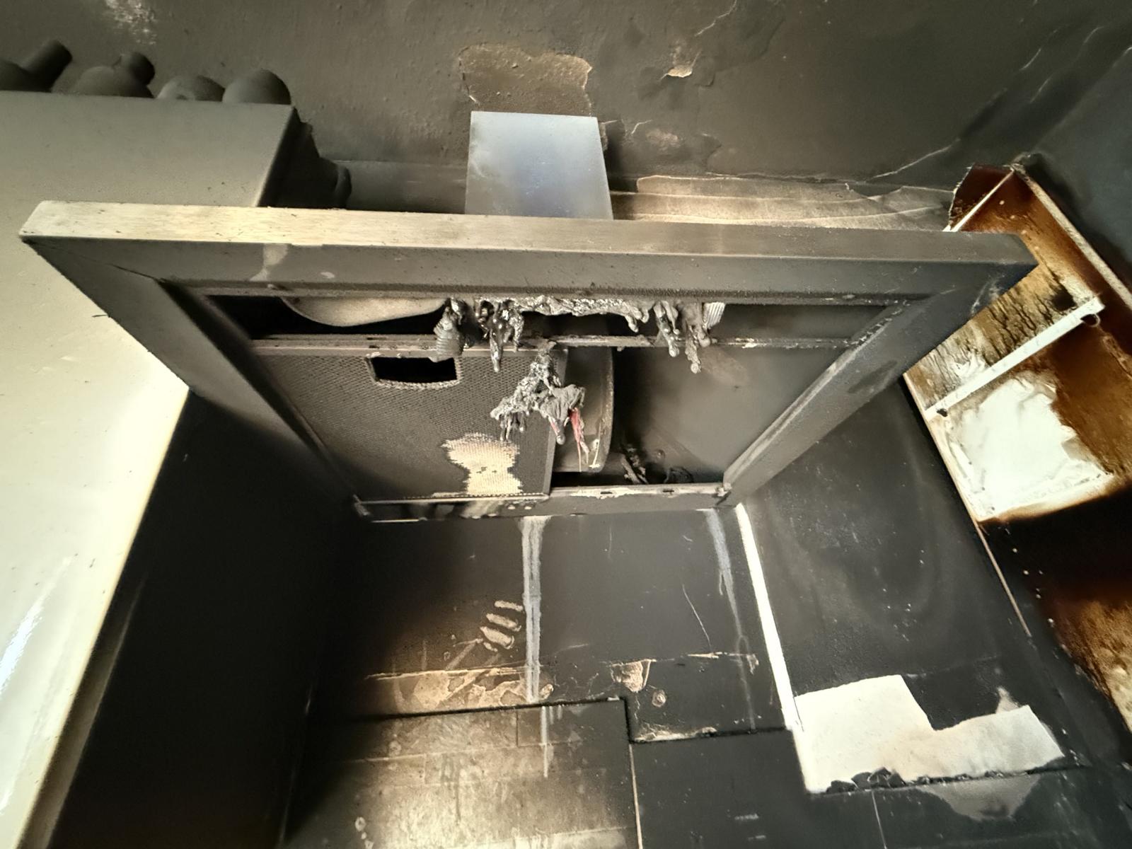 Detailaufnahme: Zerstörte Dunstabzugshaube nach Brand