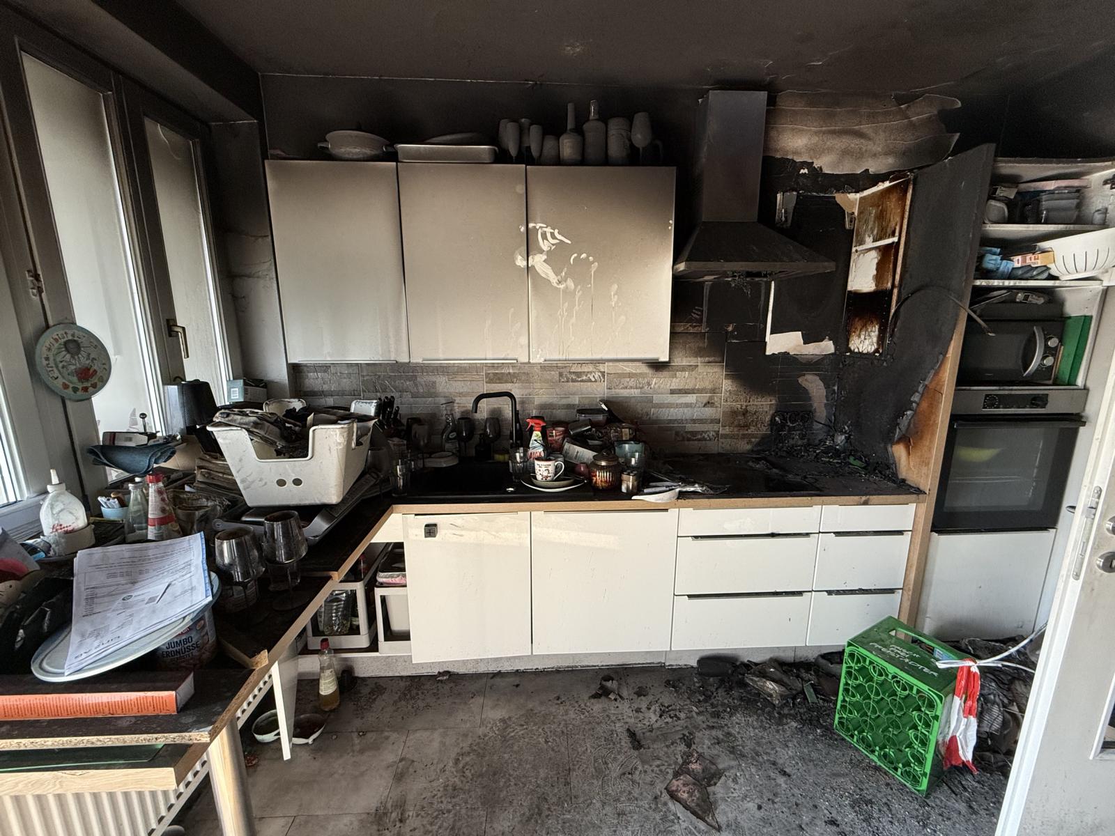 Küchenbrand – Brandherd mit starker Rauchentwicklung, Ruß an Wänden und Decke
