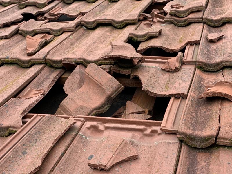 Detailaufnahme: gebrochene Ziegel mit Einschlagspuren durch Hagel