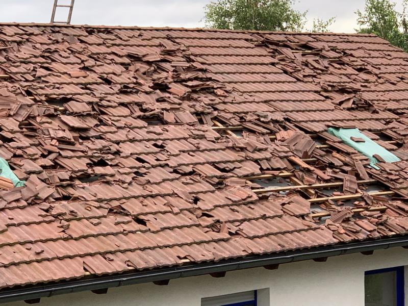 Übersicht eines massiv durch Hagel beschädigten Ziegeldachs