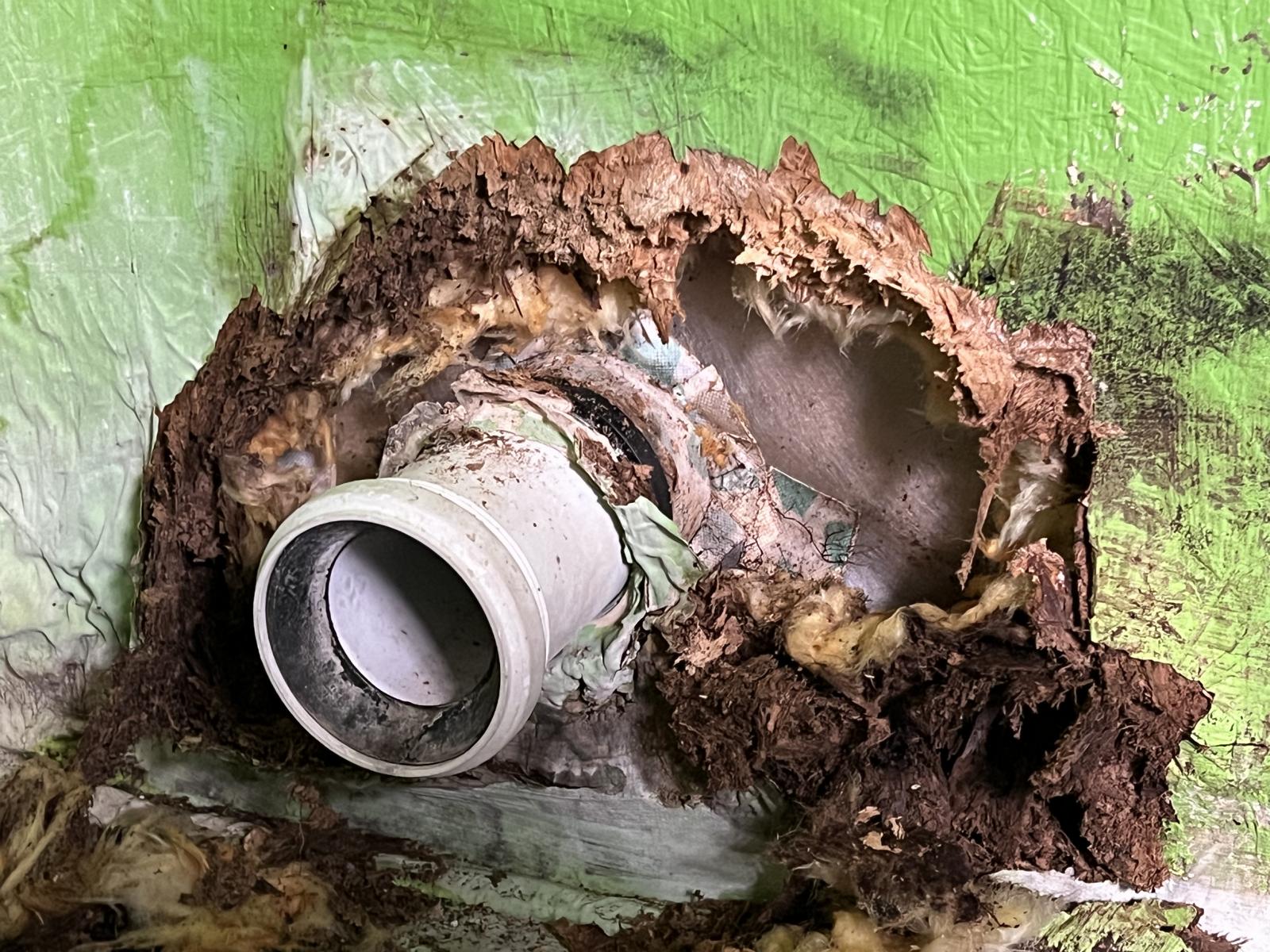Massiver Feuchtigkeitsschaden an Rohrdurchführung – Isolierung und Wandmaterial zerstört